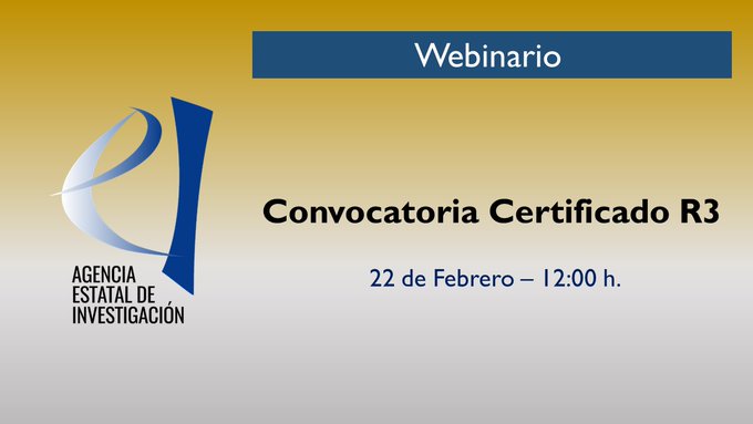 Webinar Certificado R3 (AEI) Eventos por Piotr Adam Andruczyk - 16 febrero, 202323 enero, 20260 La AEI celebrará un webinar para presentar la próxima convocatoria Certificado R3 - 2023. Fecha: 22 febrero - 12:00 h. Participación: https://us06web.zoom.us/j/87856230930 Ficha convocatoria: https://bit.ly/3Xt2ibx