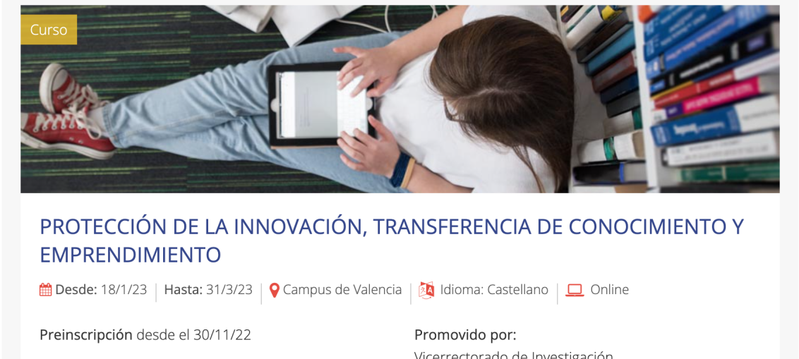 Free training course for researchers on PROTECTION OF INNOVATION, KNOWLEDGE TRANSFER AND ENTERPRENEURSHIP Calls Milestones Training by Piotr Adam Andruczyk - 2 December, 202223 January, 20260 Among the activities that the UPV is carrying out in the framework of the Human Resources Strategy for Researchers (HRS4R, https://hrs4r.blogs.upv.es/) the development of training courses in areas of interest to the research community is included. On January 18, 2023, the ONLINE COURSE: PROTECTION OF INNOVATION, KNOWLEDGE TRANSFER AND ENTREPRENEURSHIP will start. It is a 30-hour course, free of charge, and aimed at UPV researchers from their postdoctoral stage, as well as R&D&I management technicians. Registration is open through the CFP website: PROTECTION OF INNOVATION, KNOWLEDGE TRANSFER AND ENTREPRENEURSHIP January-2023. We encourage you to participate! Blanco-Azul-Gris-Foto-Feria-Empleo-Folleto-3-1Download