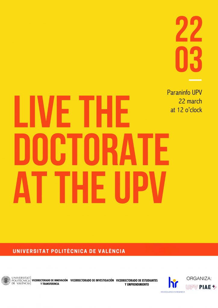 On Tuesday, March 22 at 12:00, the event “LIVE THE DOCTORATE AT THE UPV” will be held, the objective of which is to present all the opportunities that doctoral students have at our university.