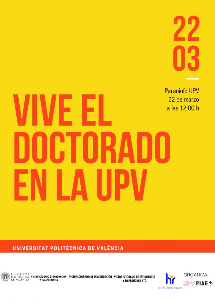 Jornada informativa VIVE EL DOCTORADO EN LA UPV Eventos por Piotr Adam Andruczyk - 28 febrero, 202223 enero, 20260 El martes 22 de marzo a las 12:00 se celebrará el evento “VIVE EL DOCTORADO EN LA UPV” cuyo objetivo es dar a conocer todas las oportunidades que tienen en nuestra universidad los doctorandos. La jornada consiste en dos partes: la sesión de bienvenida que tendrá lugar en el Paraninfo y la feria de los servicios de la UPV organizada en el jardín adyacente. [media]b821d0b0-988c-11ec-a21e-896fac17618d:640:360[/media]