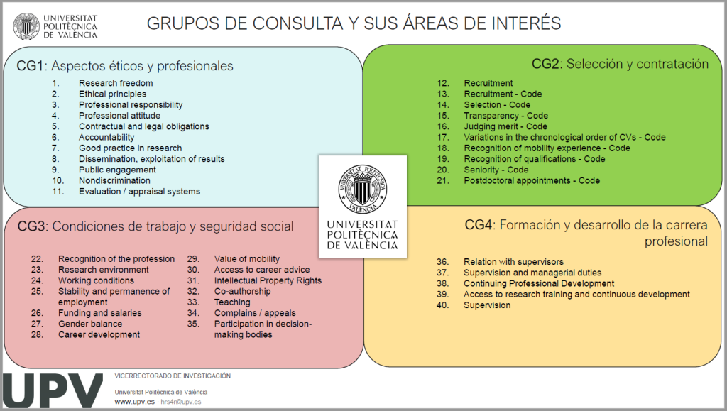 Reunión Consultation Group 3: Condiciones de Trabajo y Seguridad Social Sin categoría por Piotr Adam Andruczyk - 20 octubre, 202223 enero, 20260 El 6 de octubre de 2022 se celebró la reunión del Consultation Group 3: Condiciones de trabajo y Seguridad Social de la Human Resources Strategy for Researchers de la UPV. Consultation Group 3: Condiciones de Trabajo y Seguridad Social El objetivo de la reunión fue comentar los avances en la implementación de los principios de la Carta Europea del Investigador y el Código de Conducta para la Contratación de Investigadores correspondientes al área de interés de este grupo. Como resultado de la reunión se generó un informe con observaciones del grupo que a continuación se trasladó al Steering Committee.